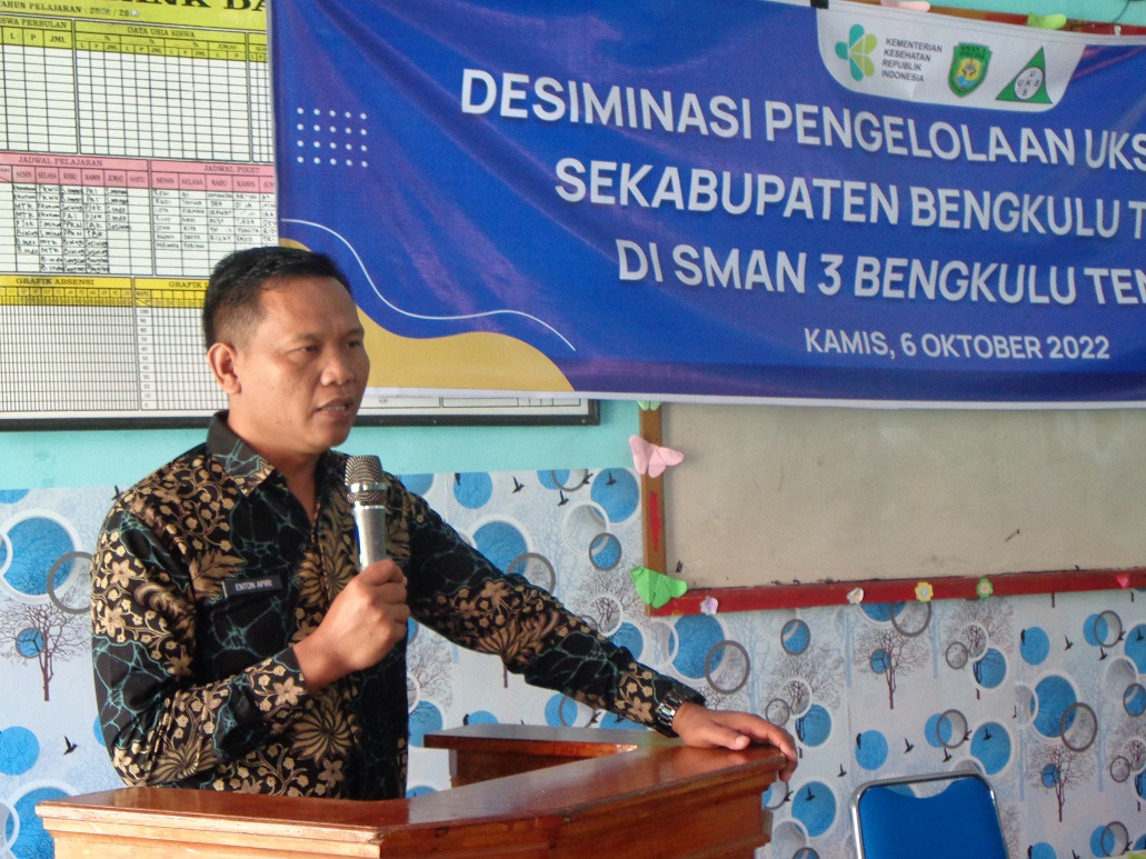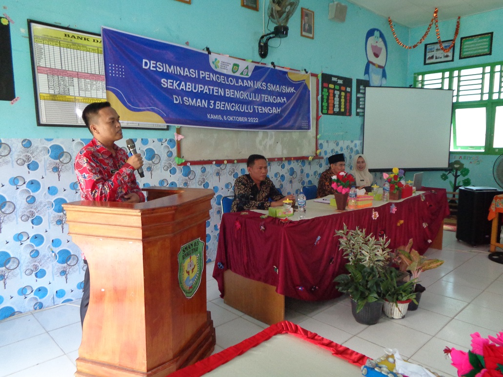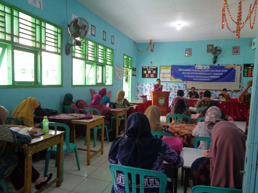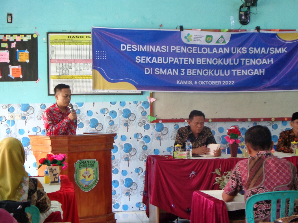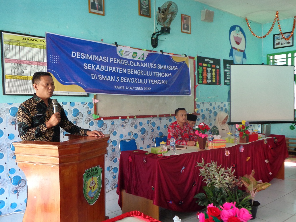 Kata sambutan pada kegiatan Diseminasi Pengelolaan UKS SMA/SMK sekabupaten Bengkulu Tengah di SMAN 3 Bengkulu Tengah disampaikan kepala SMAN 3 Bengkulu Tengah bapak Enton Apiri, S.Pd. dan dilanjutkan dengan pembukaan kegiatan Diseminasi Pengelolaan UKS SMA/SMK sekabupaten Bengkulu Tengah oleh Kacabdin wilayah IX Bengkulu Tengah bapak Maryono, SE.