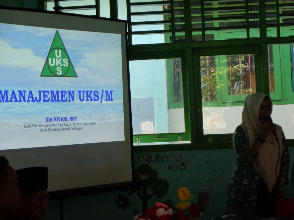 Materi yang disampaikan adalah manajemen UKS/M. Pada kesempatan ini ibu Ida Riyani, SST menyampaikan UKS merupakan wadah dan program untuk meningkatkan kemampuan hidup sehat dan derajat kesehatan peserta didik sedini mungkin, yang dilakukan secara terpadu oleh 4 kementrian terkait beserta seluruh jajarannya baik di pusat maupun di daerah. Adapun landasannya, peraturan bersama 4 Menteri yaitu Menteri Pendidikan Nasional, Menteri Kesehatan, Menteri Agama dan Menteri Dalam Negeri. Ibu Ida juga menambahkan “usaha kegiatan dilakukan melalui, kegiatan intrakurikuler, kegiatan ekstrakurikuler, serta melalui usaha-usaha lain diluar sekolah yang dilakukan dalam rangka pembinaan dan pemeliharaan kesehatan masyarakat.”