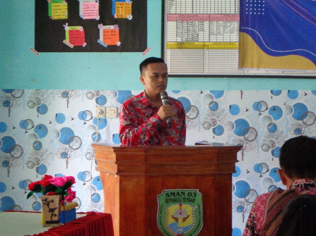 Pemateri kedua pada kegiatan Diseminasi Pengelolaan UKS SMA/SMK sekabupaten Bengkulu Tengah dari pihak SMAN 3 Bengkulu Tengah dari ketua program KKR SMAN 3 Bengkulu Tengah yang diwakilkan oleh wakil ketua program KKR bapak Agung Zamanto, M.Pd. si menyampaikan materi tentang Implementasi Optimalisasi Pengelolaan UKS SMAN 3 Bengkulu Tengah.