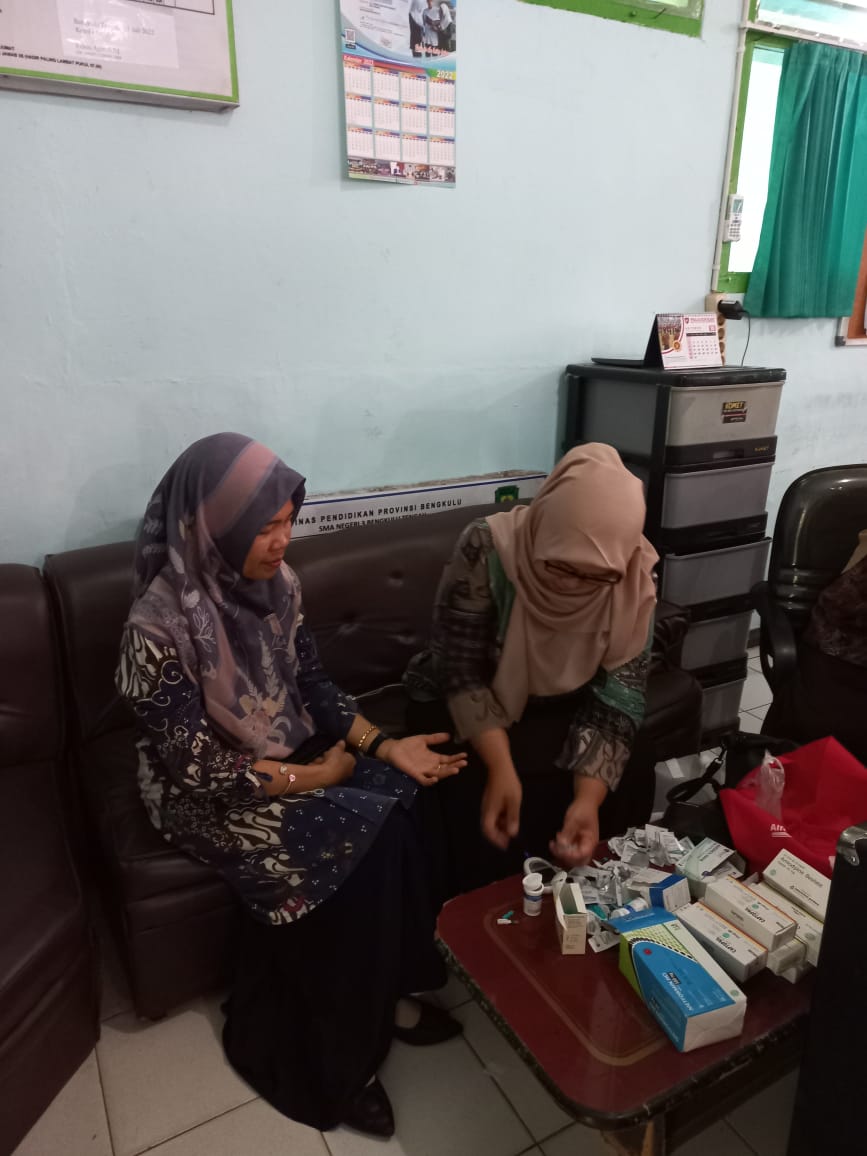 Bengkulu Tengah, Kamis 13 Oktober 2022 - Kegiatan pemeriksaaan kesehatan rutin untuk bapak/ibu guru, staf TU dan seluruh anggota staf di lingkungan SMA Negeri 3 Bengkulu Tengah oleh pihak Puskesmas Pekik Nyaring. Pada Kamis pagi pemeriksaan kesehatan rutin oleh Puskesmas Pekik Nyaring di ruang Guru SMA Negeri 3 Bengkulu Tengah. Kegiatan ini dikhususkan bagi bapak/ibu guru serta staf tata usaha di lingkungan sekolah merupakan Program Puskesmas Pekik Nyaring.