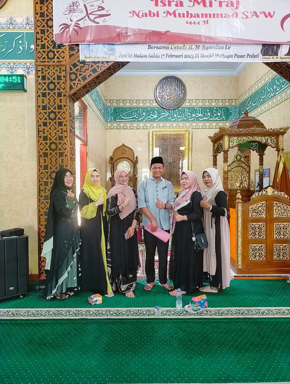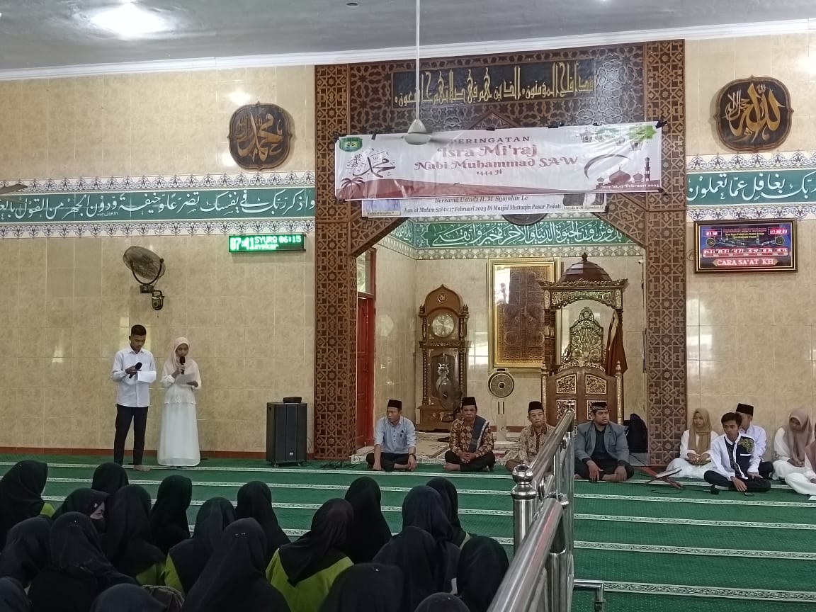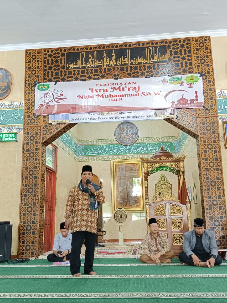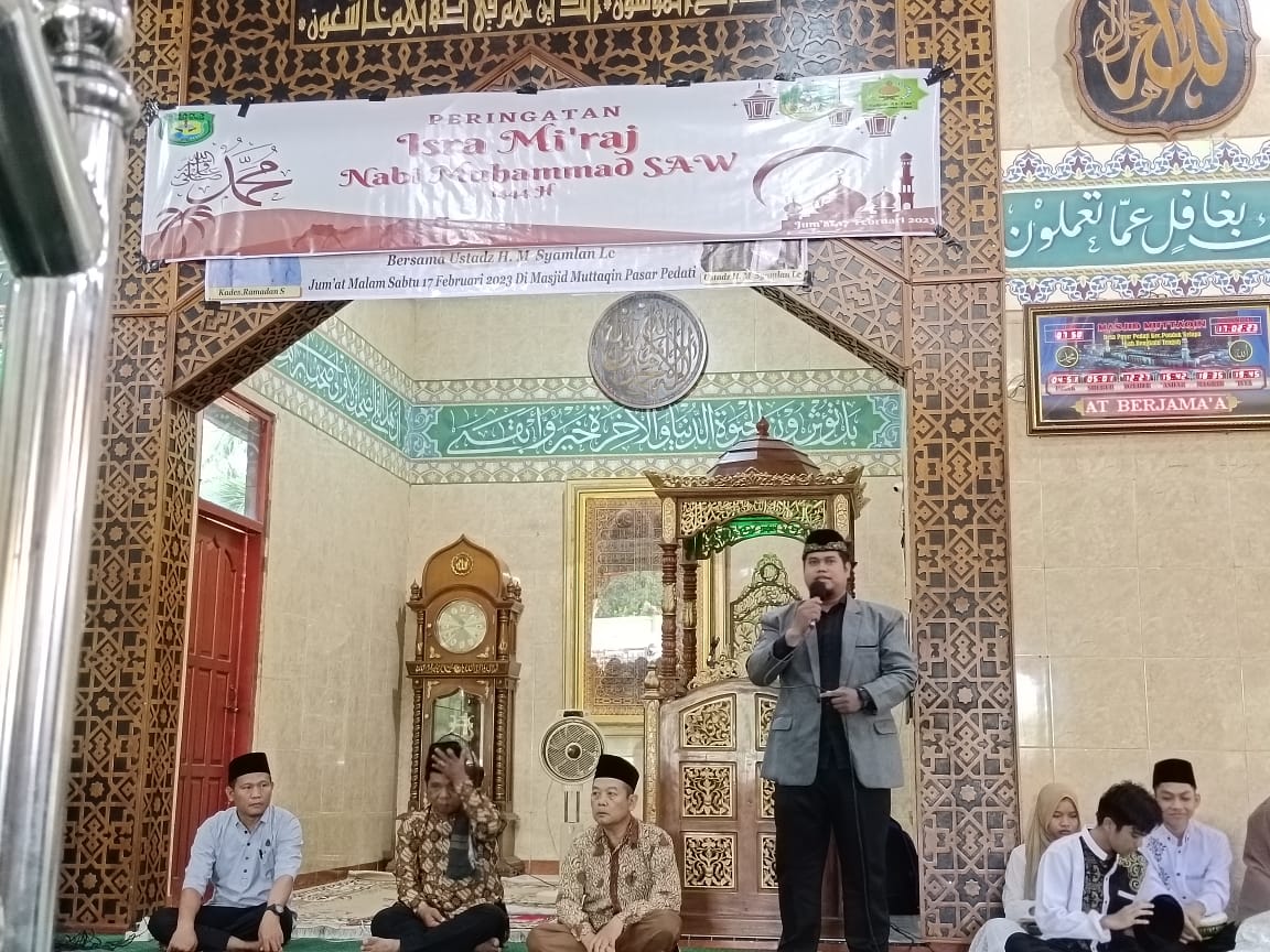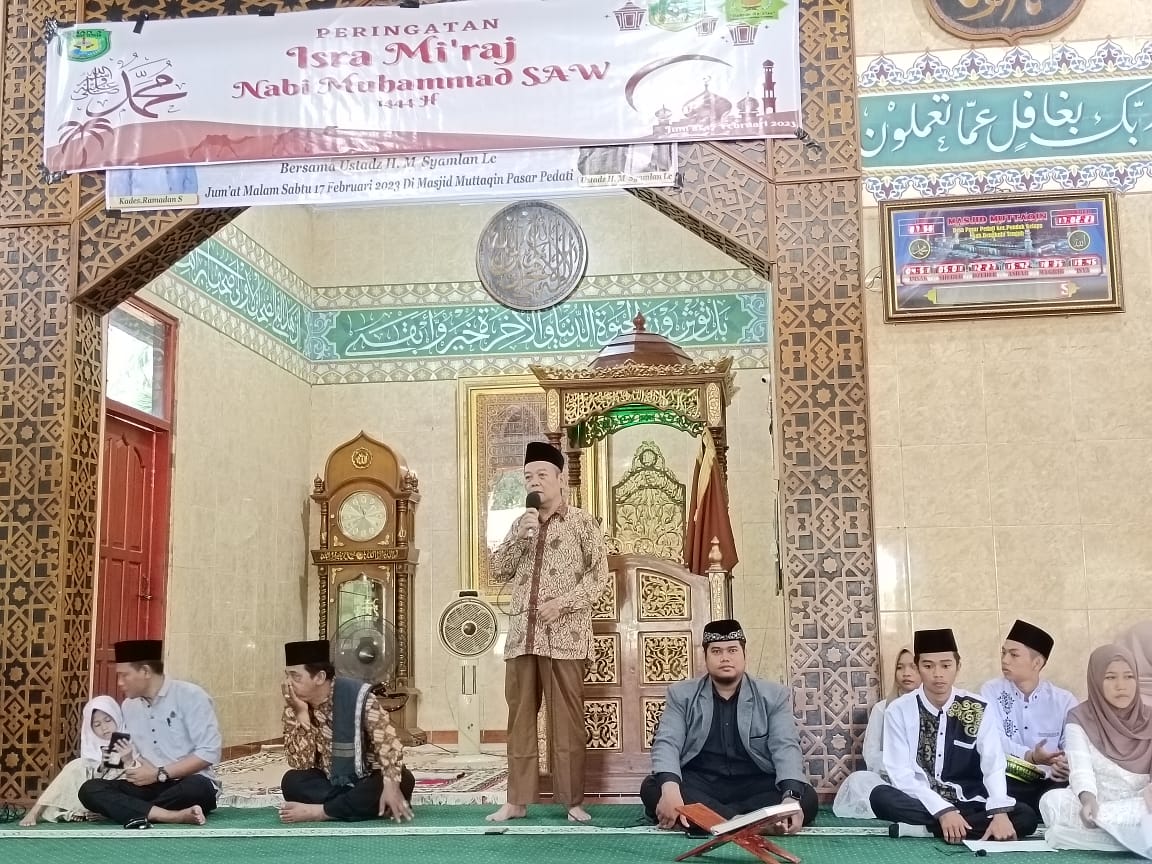 Acara peringatan Isra Mi’raj Nabi Muhammad SAW 27 Rajab 1444 H di Masjid Muttaqien Desa Pasar Pedati Bengkulu Tengah pada Jumat, 17 Februari 2023 dilanjutkan dengan ceramah agama tentang perjalanan spiritual Rasulullah Nabi Muhammad SAW, termasuk dalam melakukan negosiasi salat 5 waktu.