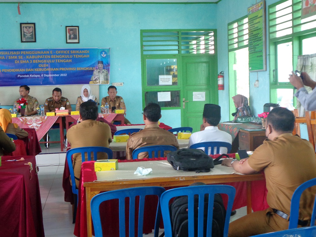 Bengkulu Tengah – Dinas Pendidikan dan Kebudayaan Provinsi Bengkulu melakukan sosialisasi penggunaan aplikasi e-office Sistem Informasi Kearsipan Dinamis Terintegrasi (SRIKANDI) pada seluruh staf dan operator SMA/SMK se-kabupaten Bengkulu Tengah di SMAN 3 Bengkulu Tengah, Pondok Kelapa (6/09/2022).