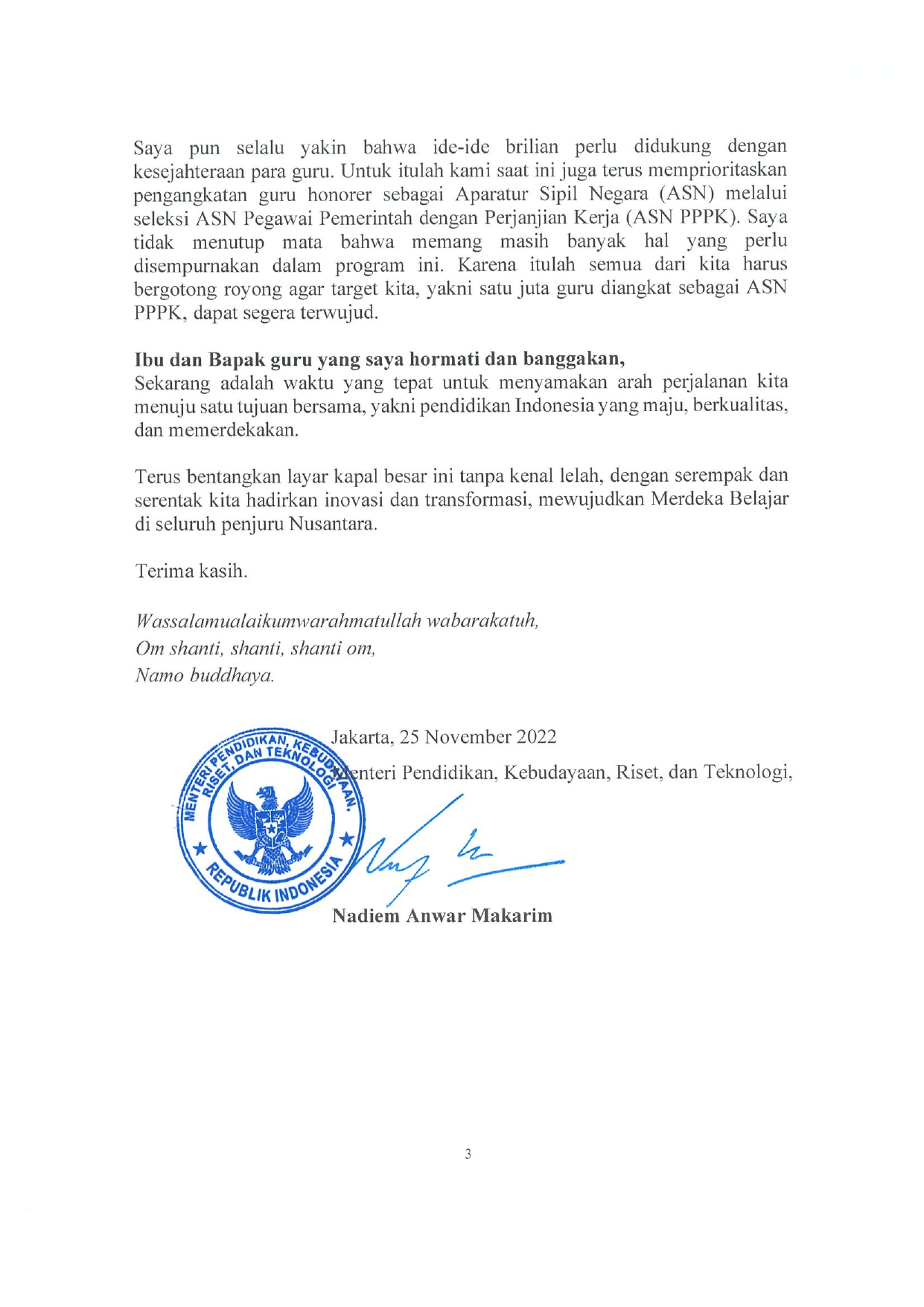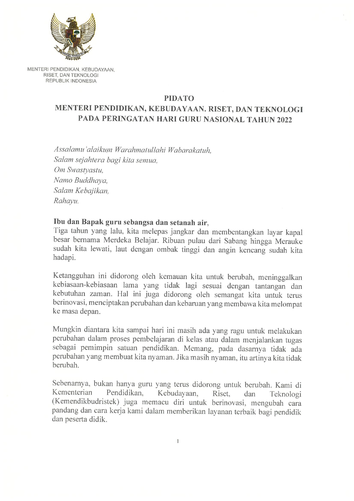 Kepala SMAN 3 Bengkulu Tengah bapak Enton Apiri, S.Pd selaku pembina upacara pada peringatan hari guru nasional memberikan amanat yang berupa Pidato Menteri Pendidikan, Kebudayaan, Riset dan Teknologi pada Peringatan Hari Guru Nasional Tahun 2022 sebagai berikut: