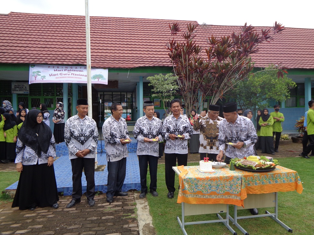 Setelah selesai upacara siswa/siswi SMAN 3 Bengkulu Tengah membuat kejutan untuk para bapak/ibu guru serta staf TU dengan serentak meneriakkan “Selamat Hari Guru” dan memberikan tumpeng, kue dan karangan bunga.